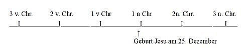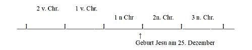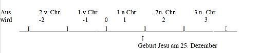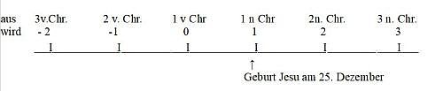 Da es sich bei der Zählung der Jahre vor Christi Geburt also eigentlich um einen extra Zeitstreifen handelt13, beginnt das Intervall des ersten Jahres vor Christi Geburt, wenn wir an die Monate denken, nicht wie in der Mathematik hinter der Zahl Null oder ohne sie kurz vor dem „Jahr 1 nach Chr.“, sondern gleich hinter der Zahl „2 v. Chr.“ auf dem Zeitstrahl mit dem Januar und endet mit dem Dezember vor der Zahl „1 nach Chr.“. Dagegen beginnt das Jahr „1 nach Chr.“ kurz nach der Zahl „1 v. Chr.“ und endet am Strich mit „1 nach Chr."